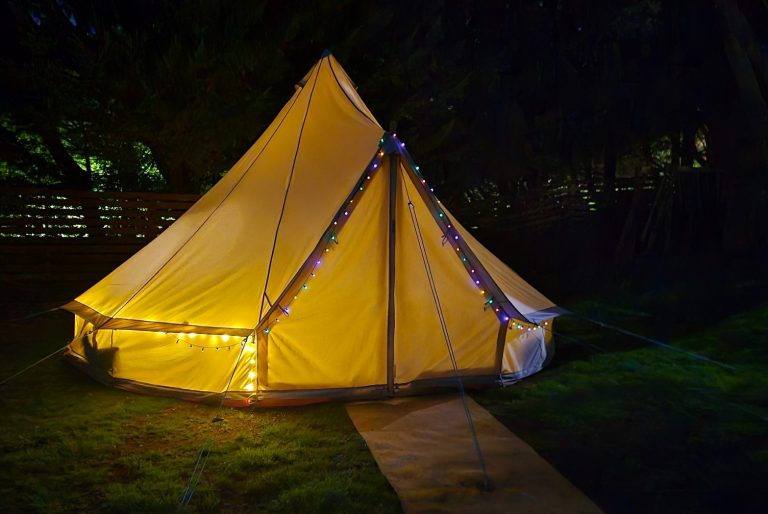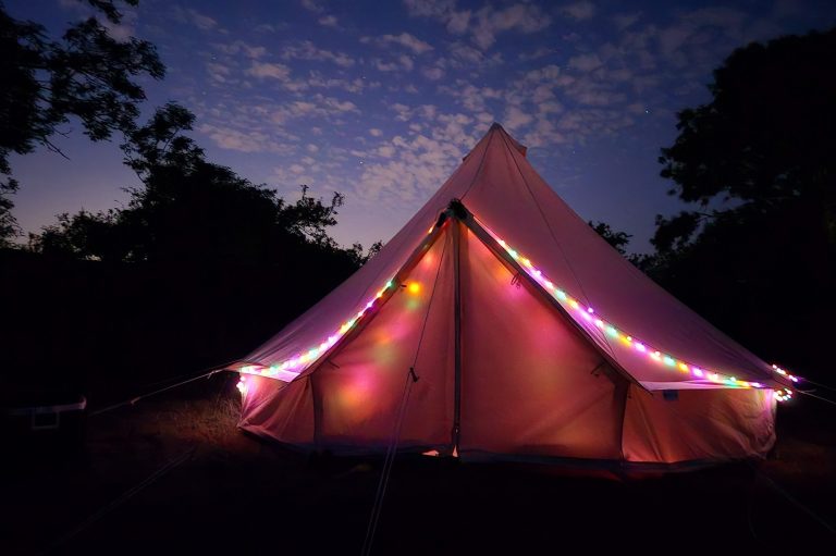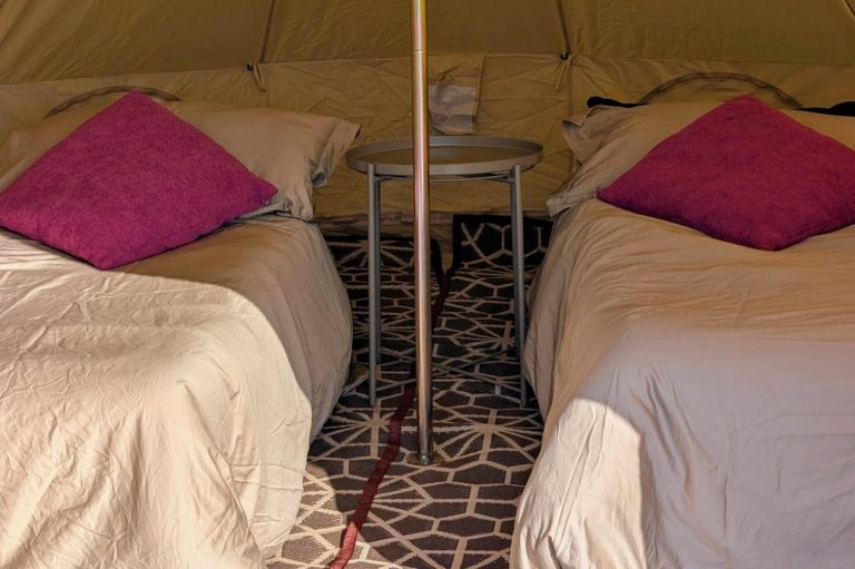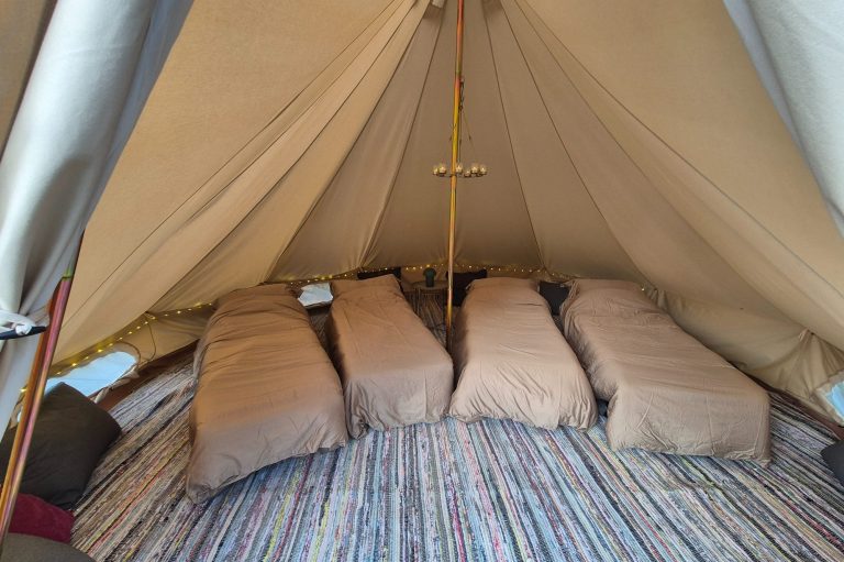 Two night hire; Including all that the 'Bell tent only' package includes, plus deluxe single camp beds with camping mattress's, pillow, duvet and bedding for four people, small table, large rug or polypropylene carpet, rechargeable table light, exterior solar powered sting lights and mobile wind up lantern = £275