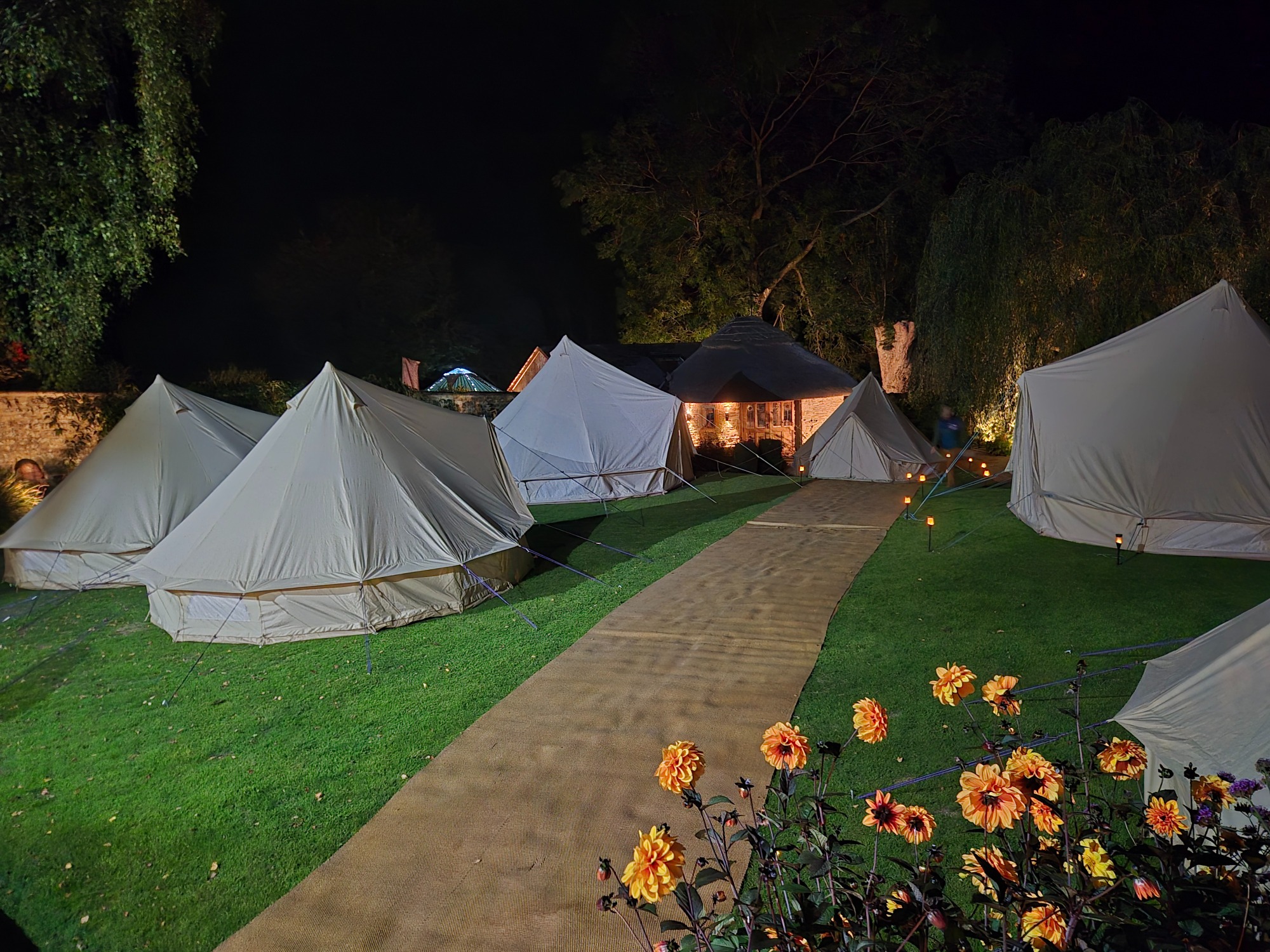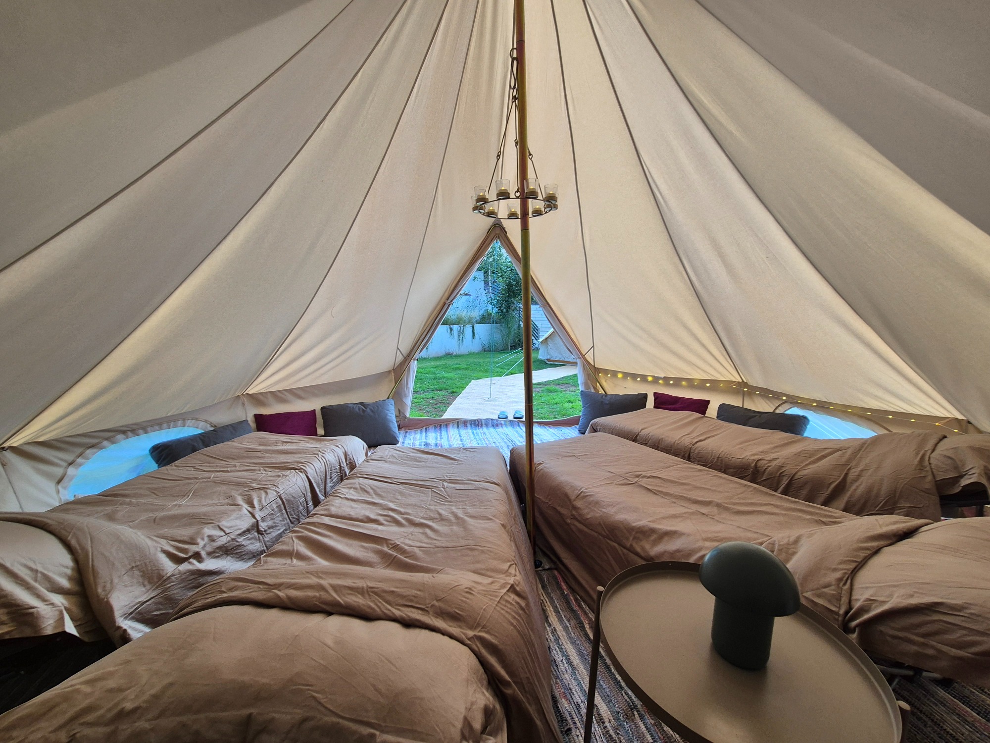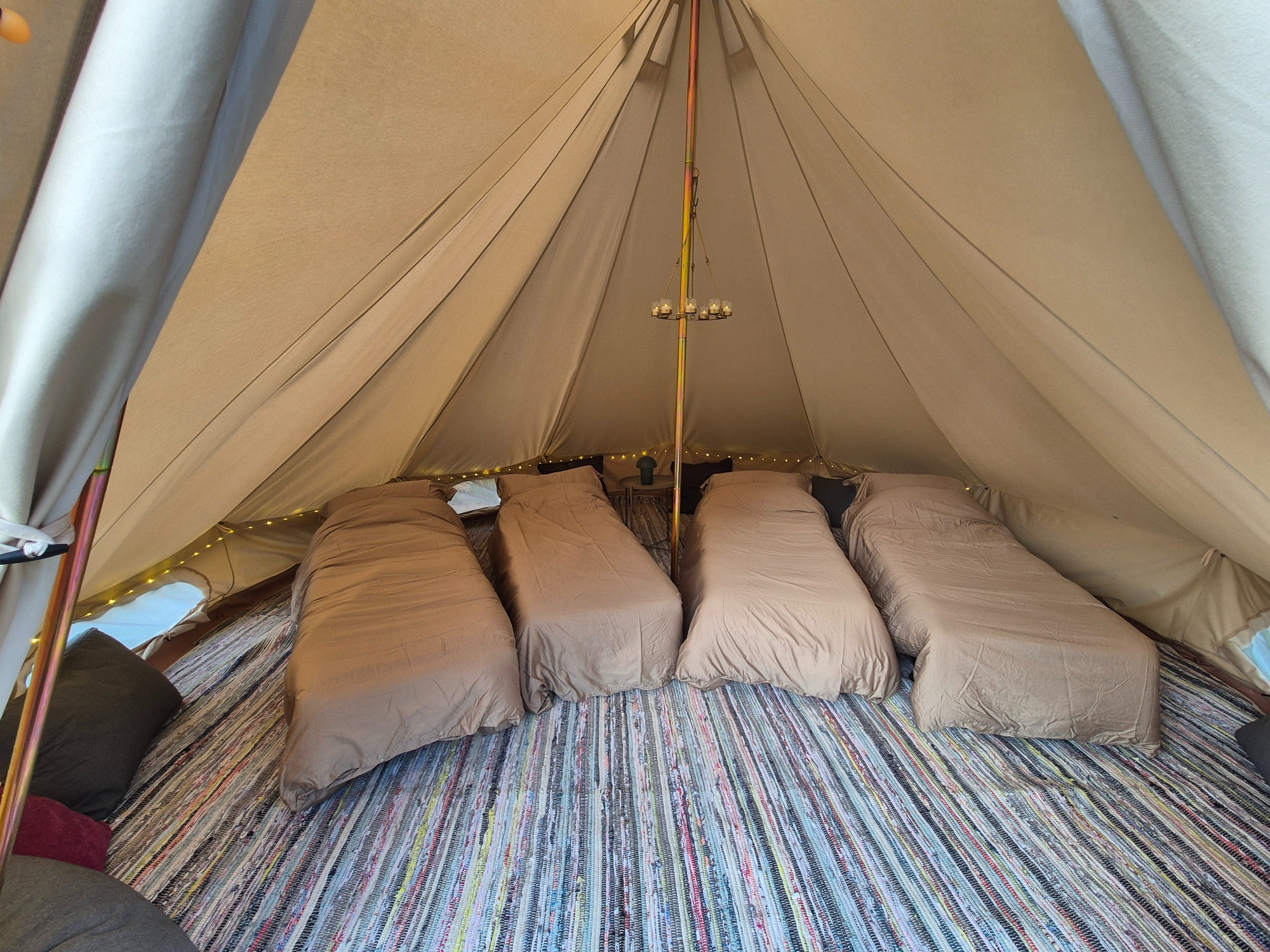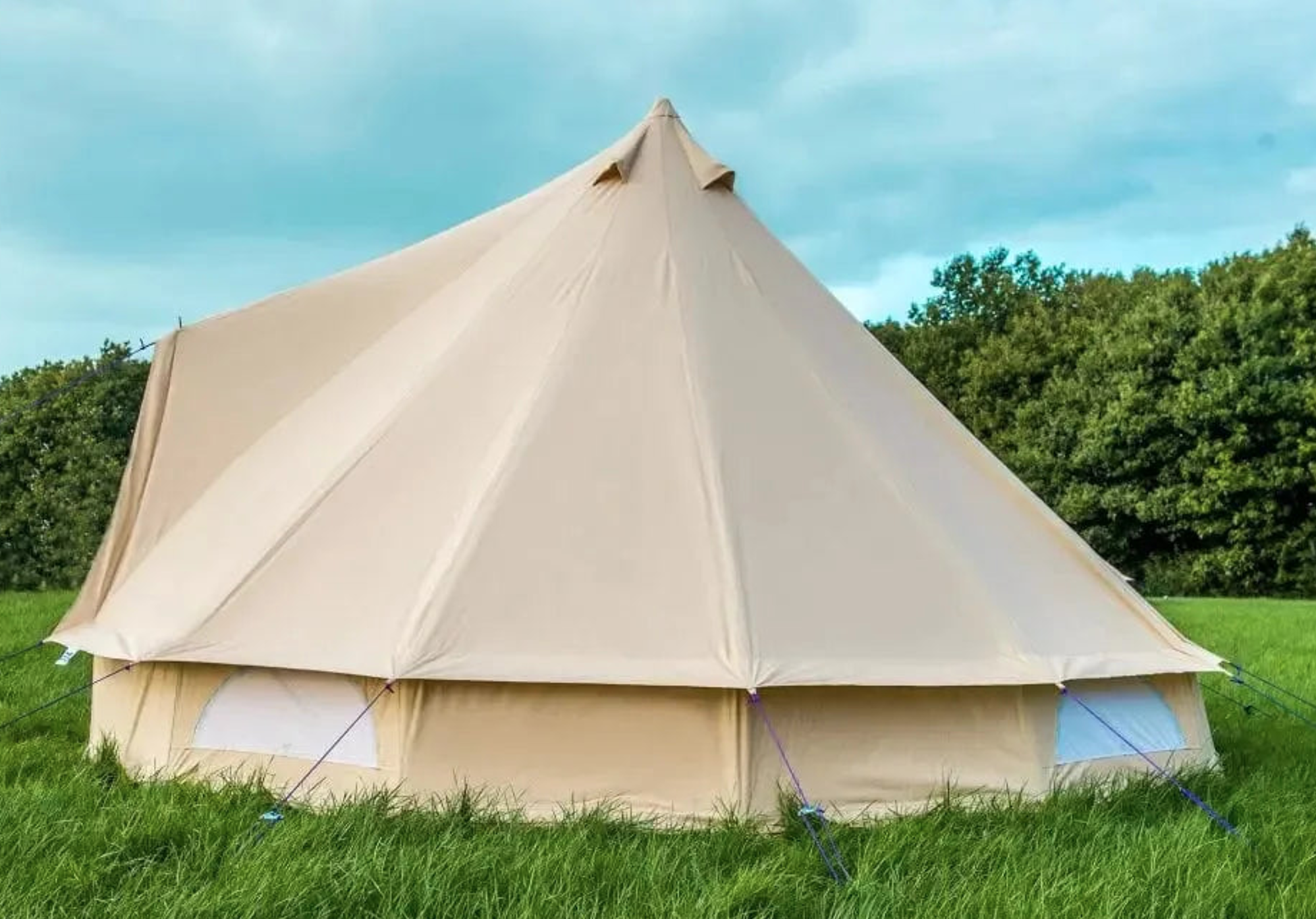 Here at Canopy, we offer camping comfort in one of our 4m or 5m recently purchased (summer 2025) Bell Tents. Each is made from quality professional standard 320 + grams per metre fabric. The 4m bell tents can cater for 3 - 4 adults (or a family of 4) and the 5m ones can cater for 5-6 adults (or a larger family).