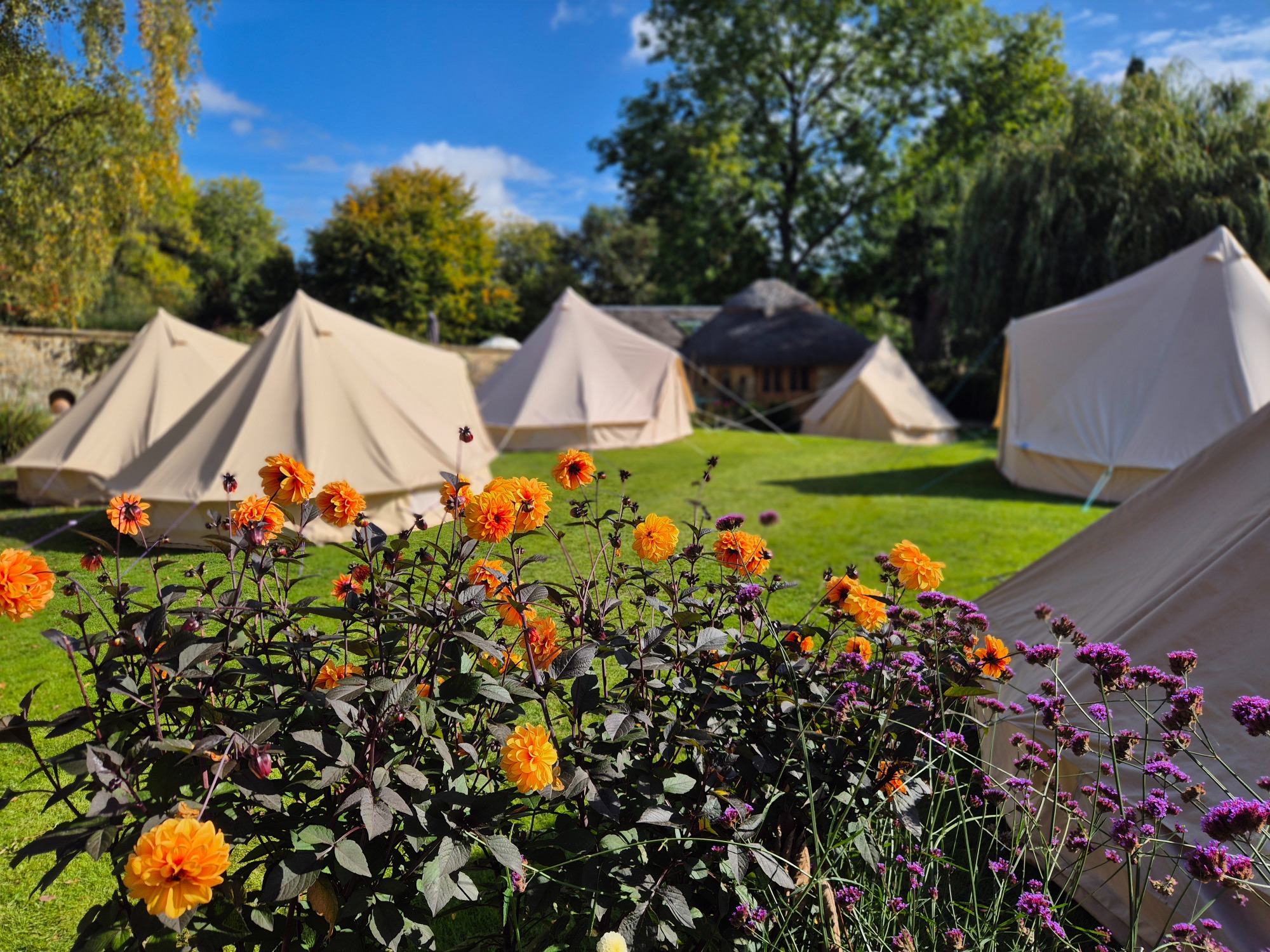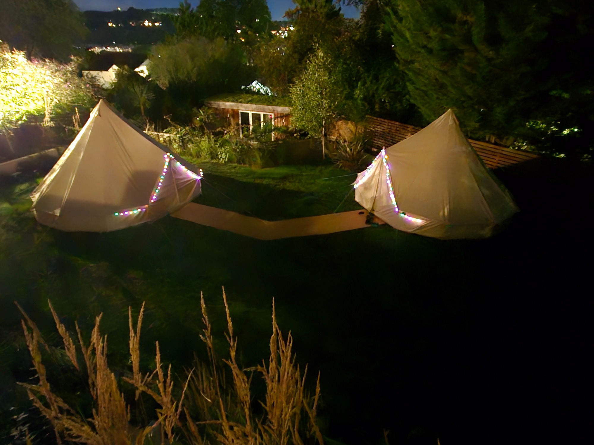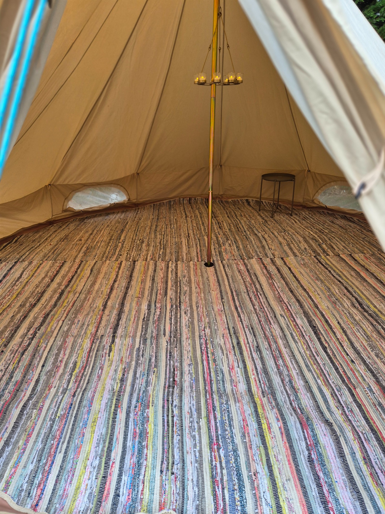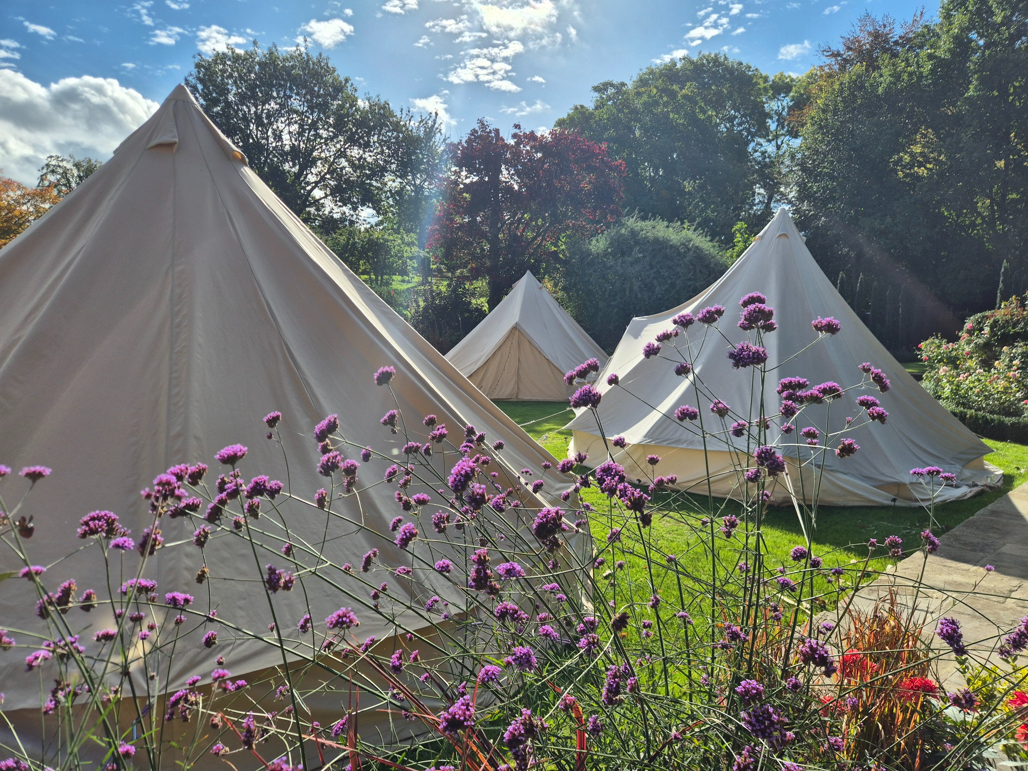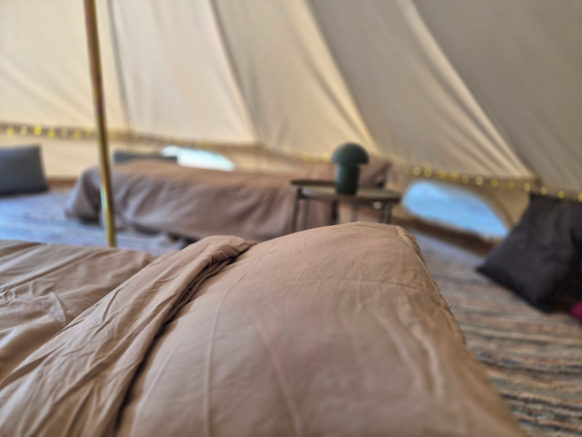 Here at Canopy, we offer camping comfort in one of our 4m or 5m recently purchased (summer 2025) Bell Tents. Each is made from quality professional standard 320 + grams per metre fabric. The 4m bell tents can cater for 3 - 4 adults (or a family of 4) and the 5m ones can cater for 5-6 adults (or a larger family).