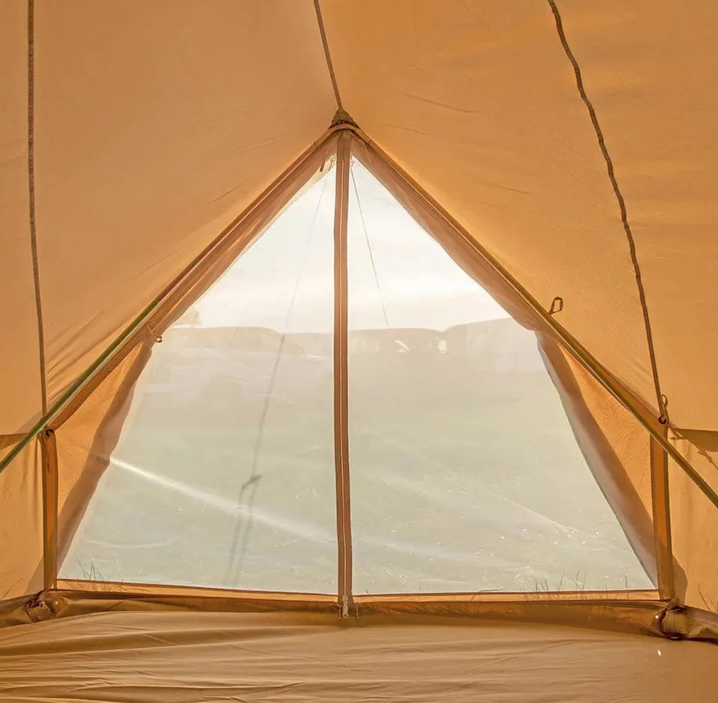 All our bell tents have zip-able windows and double mosquito net secondary doors. The 4m ones are 2.5m high/3.95m wide whereas the 5m tents are 3m high/4.95m wide.
