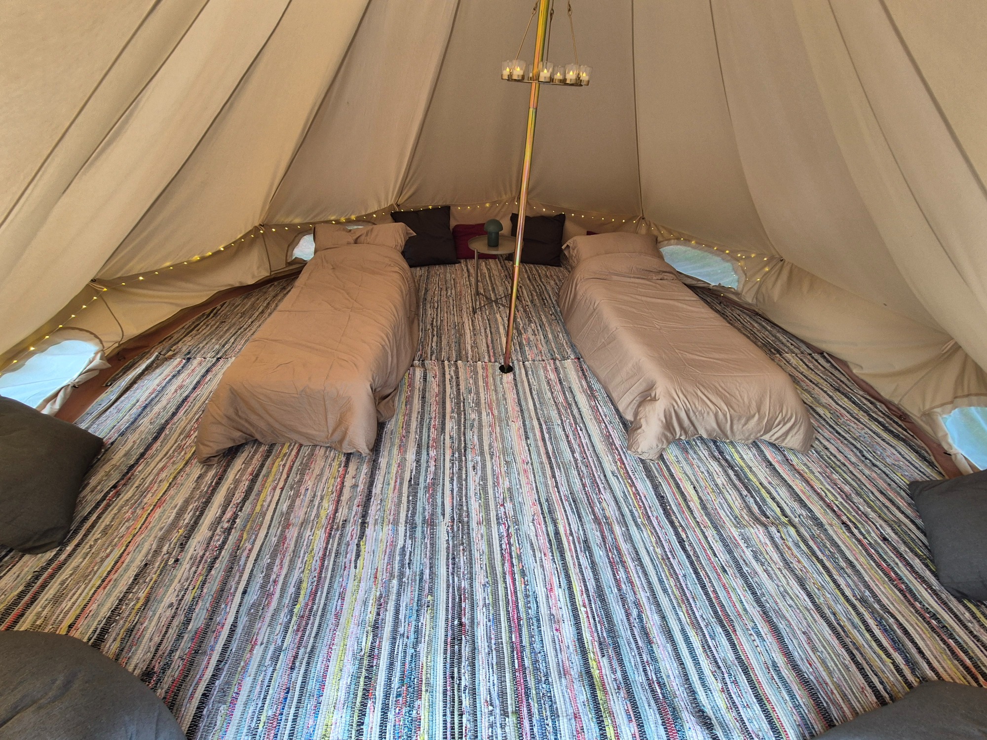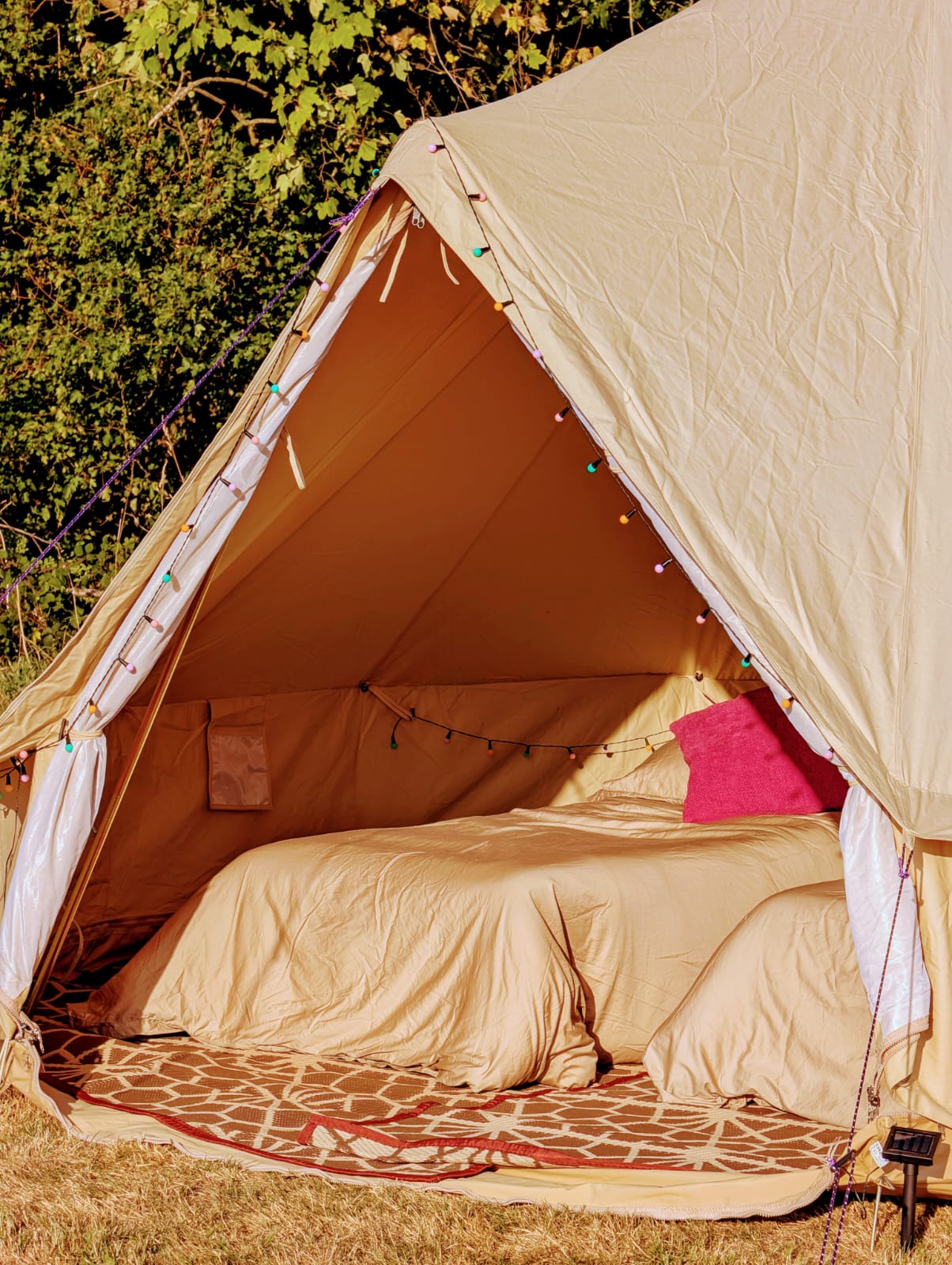 Two night hire; Including all that the 'Bell tent only' package includes, plus deluxe single camp beds with camping mattress's, pillow, duvet and bedding for four people, small table, large rug or polypropylene carpet, rechargeable table light, exterior solar powered sting lights and mobile wind up lantern = £275